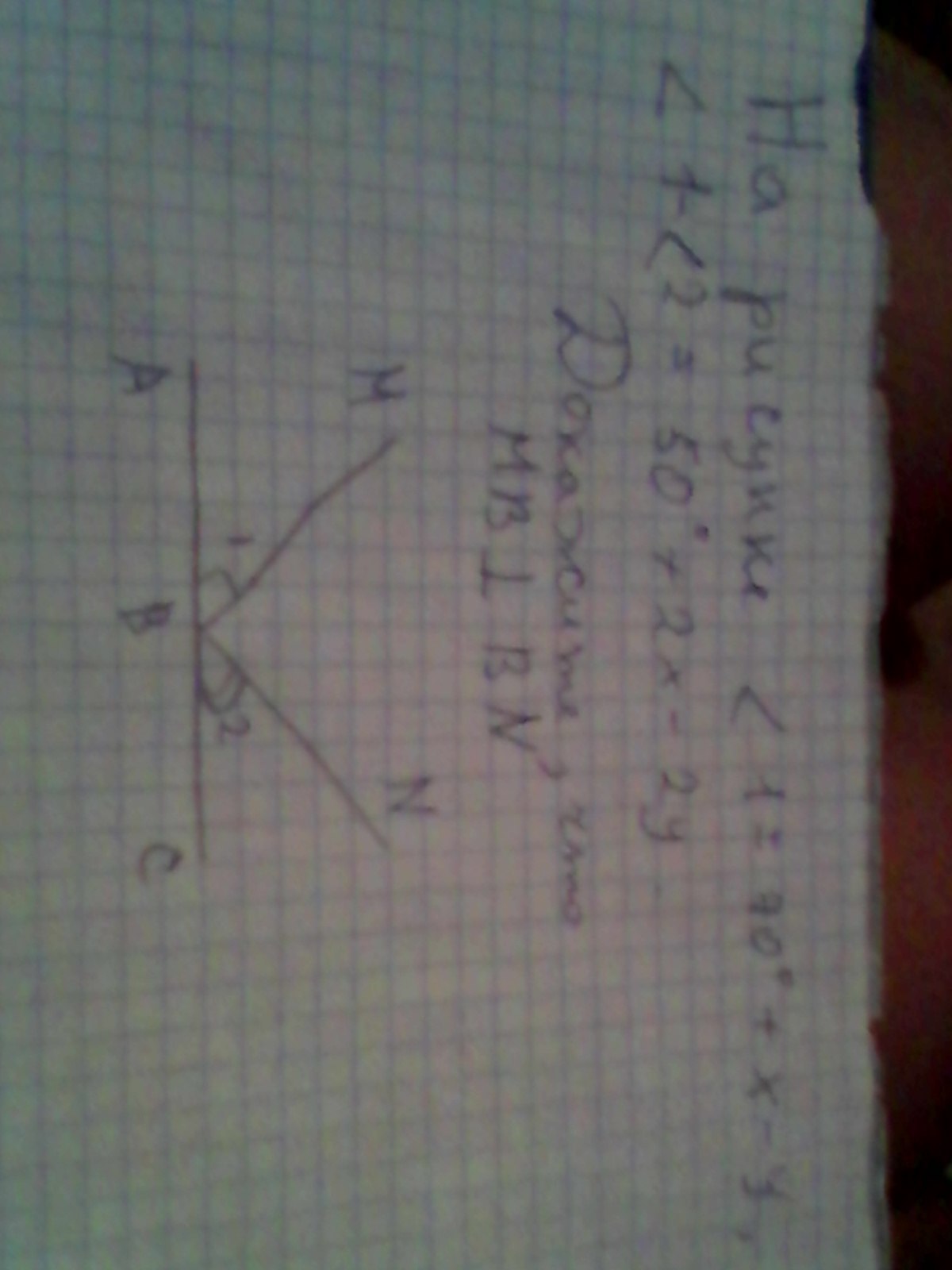 На рисунке угол 1= 70 градусов+х-у, угол 1-угол 2 =50 градусов+2х-2у . докажите ,что МВ ПЕРПЕНДИКУЛЯРНО ВN