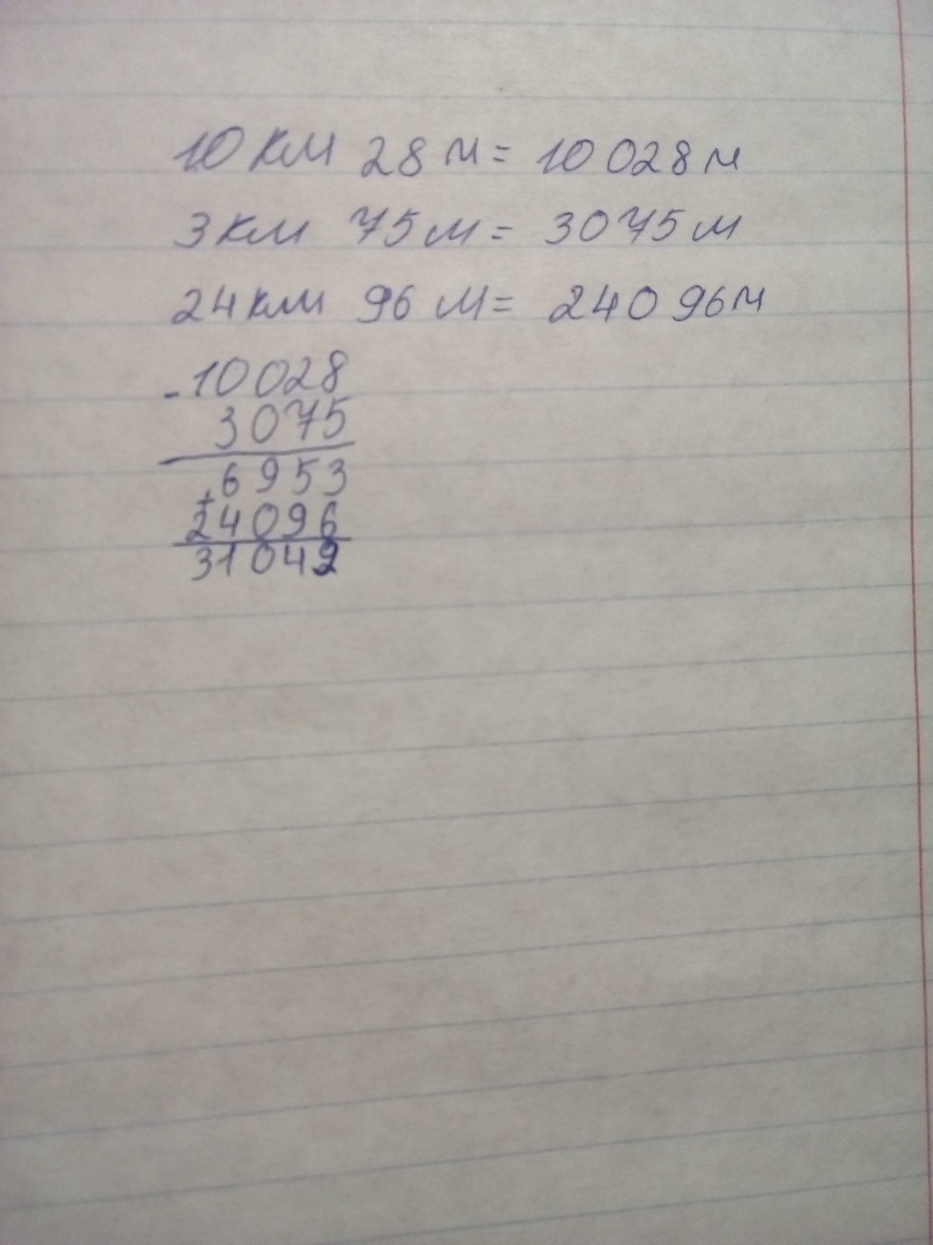 10км - 3км 75 м +24 км 96 м =31 км 49 м