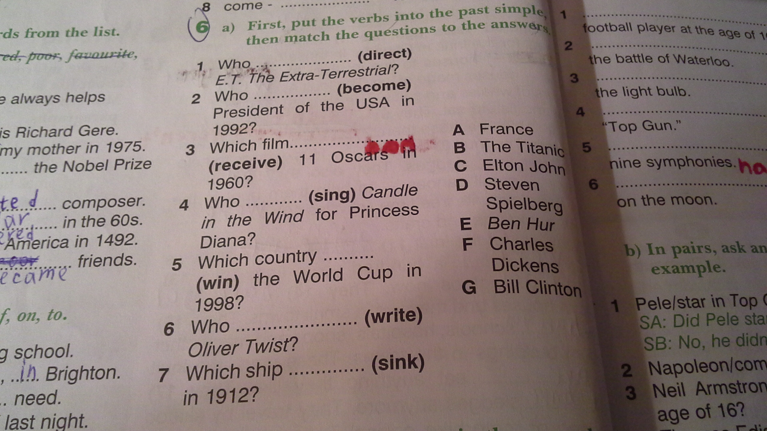 6.Fill,put the verbs into the past simple,then match the questions to the answers.