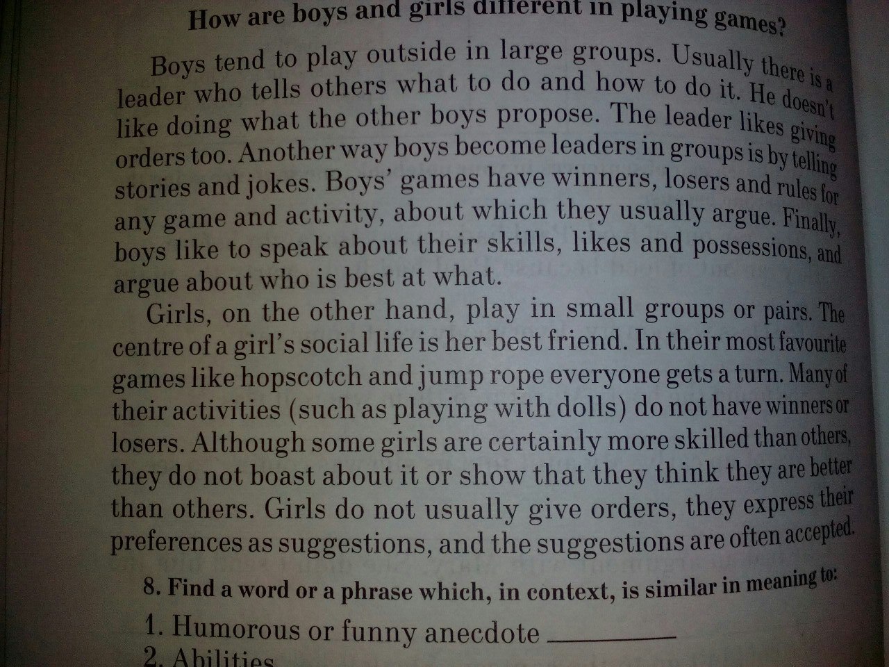 (1 часть)Мальчики имеют тенденцию играть на улице в огромных группах. Обычно в этой группе есть лидер, который говорит участникам, что делать и как это нужно делать.Он не любит делать то, что предлагают делать ему участники.Так же лидер любит отдавать приказы. Так же другие мальчики становятся лидерами за счёт рассказов историй и шуток.Игры мальчиков имеют победителей, проигравших и правила для некоторых игр и действий, про которые они часто спорят. И наконец то, мальчики любят говорить про то, что они умеют, про их влечения и про их имущество, и спорят, кто лучше.