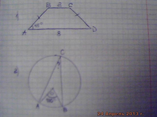 Так как угол а равен 45 градусам тогда, если опустить высоту к стороне АD из угла В тогда треугольник ABL-равнобедренный(тк углы при основании равны) соответственно если опустить высоту из угла С то тоже получим равнобедренный треугольник. Тогда АВL = ABK. LK=2. Тогда сторона ВК и сторона ВL будут равны (8-2)/2=3. Высота ВL=3. Sabcd=((8+2)/2)•3=15