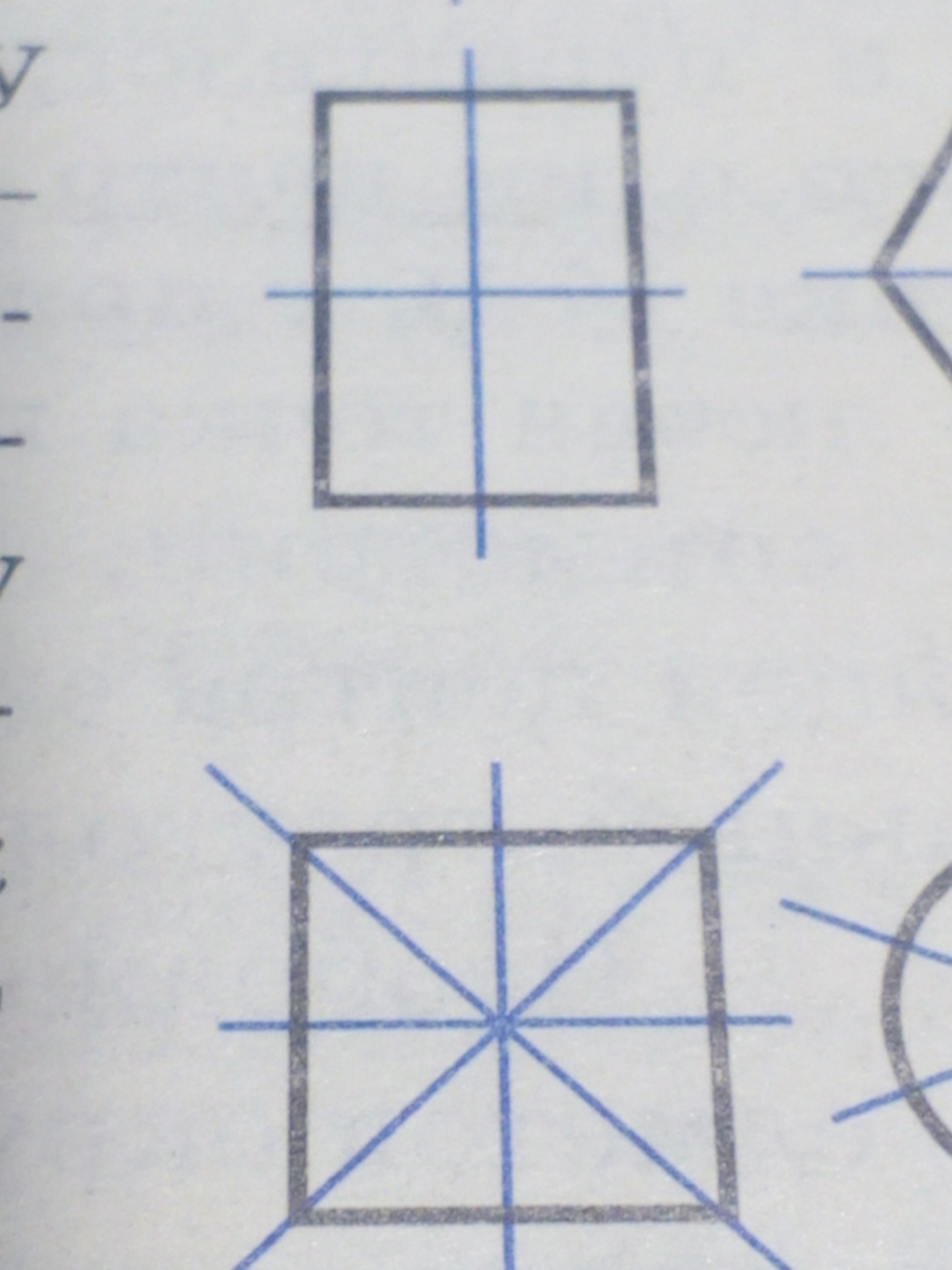 Вот два симметричных четырёхугольника: прямоугольник и квадрат, обладающих осевой симметрией.