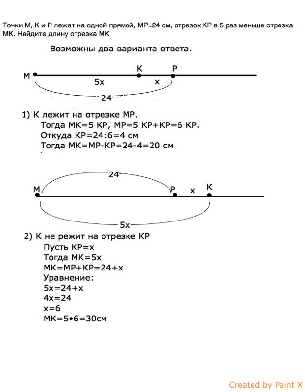 точки m, k и p лежат на одной прямой, mp=24 см, отрезок kp в 5 раз меньше отрезка MK. Найдите длину отрезка MK