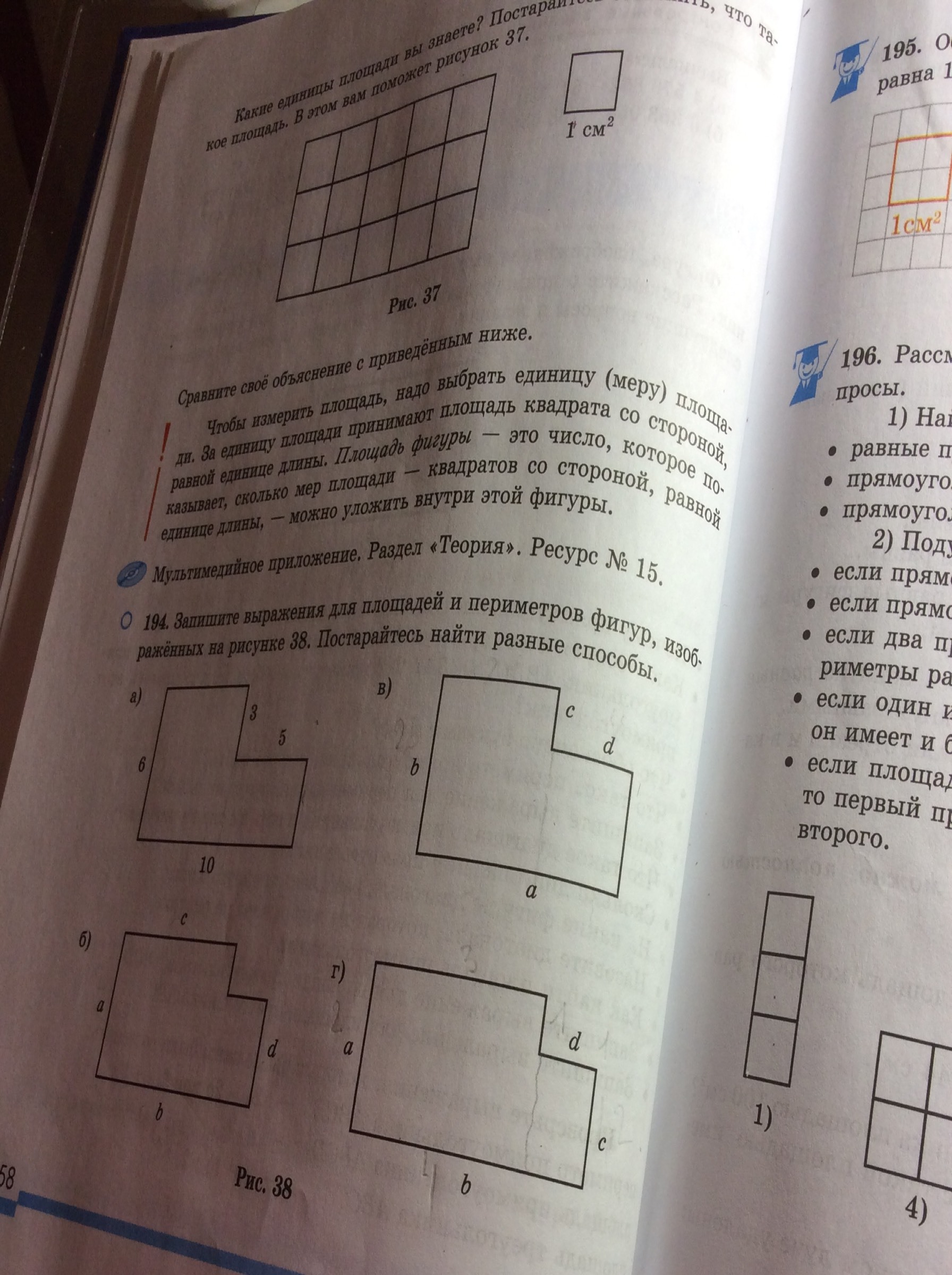 Помогите фигуры в),г) площадь и периметр