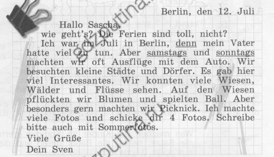 как дела? Каникулы проходят прекрасно,не правда ли? В июле я был в Берлине, поскольку у папы очень много дел. Но по субботам и воскресеньям мы часто совершали поездки на авто. Мы посещали маленькие маленькие городки и деревеньки. Там было много всего интересного. Мы видели множество лугов,лесов и рек. На лугах мы собирали цветы и играли в мяч. Но особенно мы любили устраивать пикники. Я сделал много фотографий: посылаю тебе 4 штуки. Напиши мне,приложив свои летние фото.