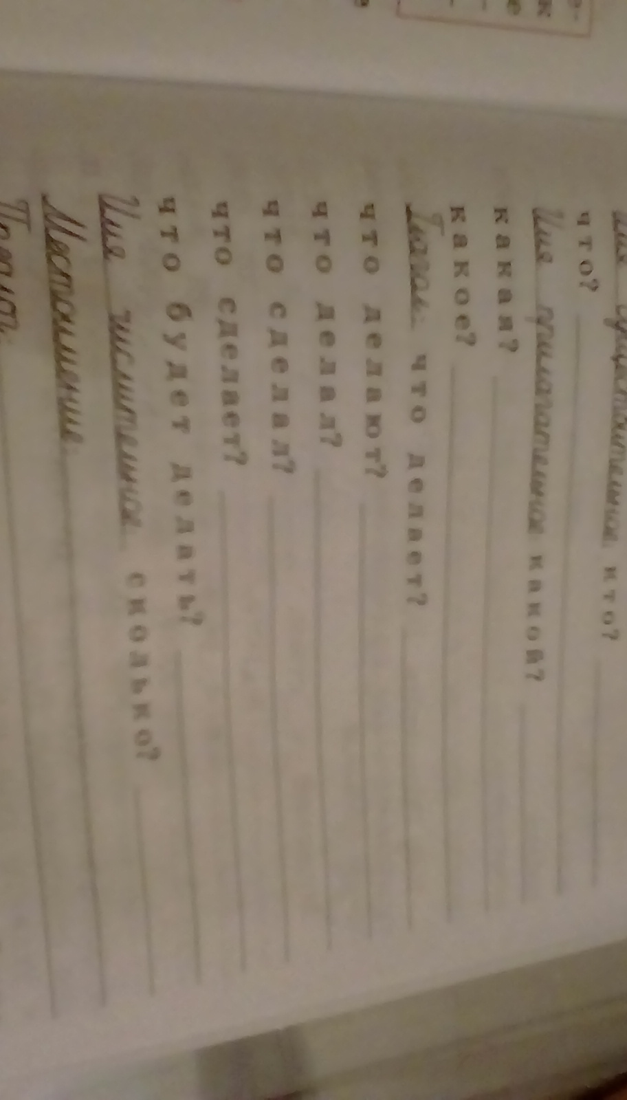 Прочитайте. Подберите и запишите имена существительные, имена прилагательные имена числительные, глаголы, которые отвечают на данные вопросы. Запишите известные вам вам местоимения и предлоги.