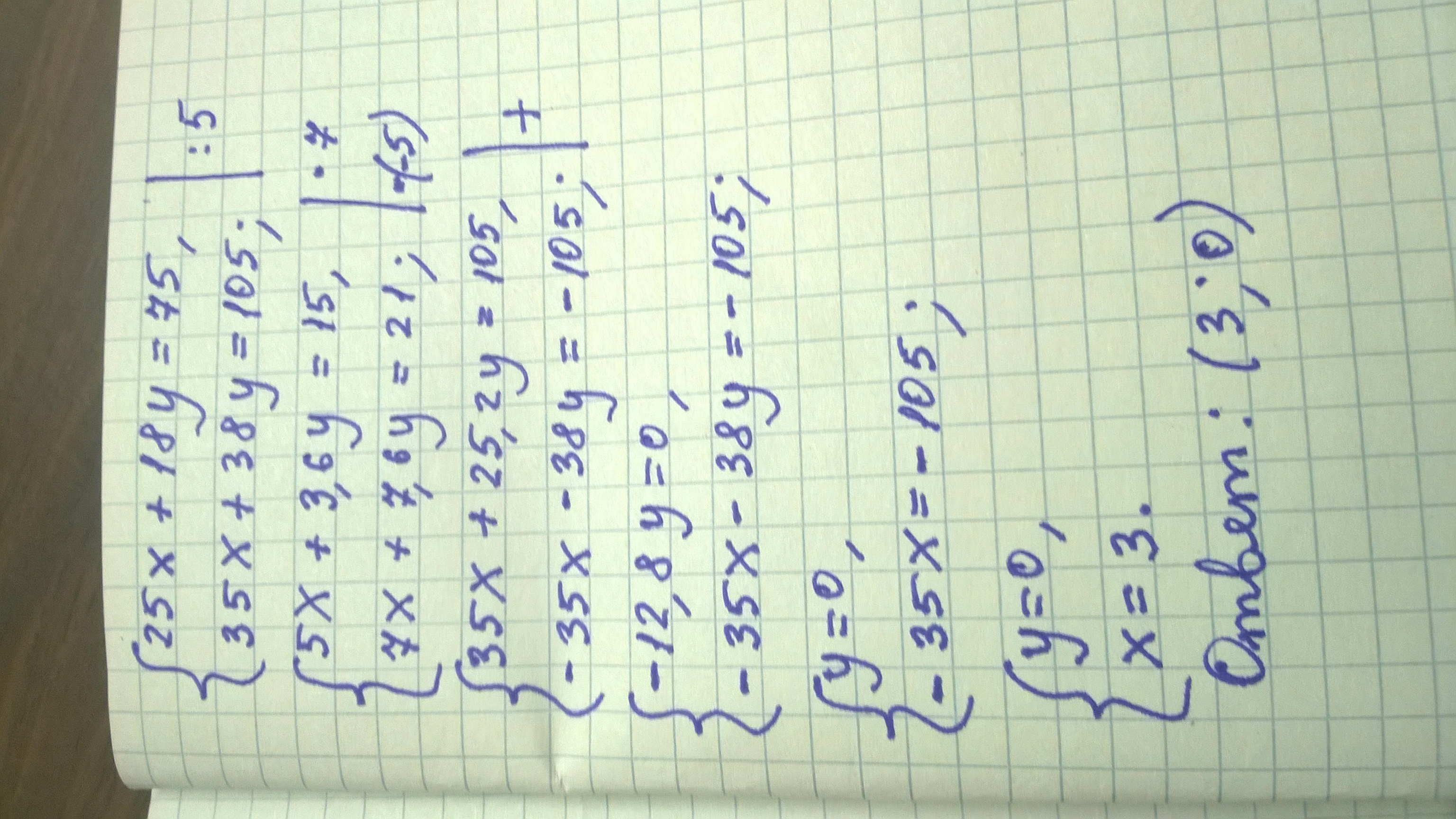Делим систему на 5 , затем приводим уравнения в удобный до нас вид ( первое уравнение умножаем на 7, второе на -5). Затем решаем систему способом алгебраического сложения. 35х и -35х взаимно уничтожаются, 105 и -105 тоже.Записываем уравнение, которое у нас получилось в ходе сокращения, а второе уравнение мы просто переписываем. Находим у и подставляем во второе уравнение. Находим х. Все просто ;)