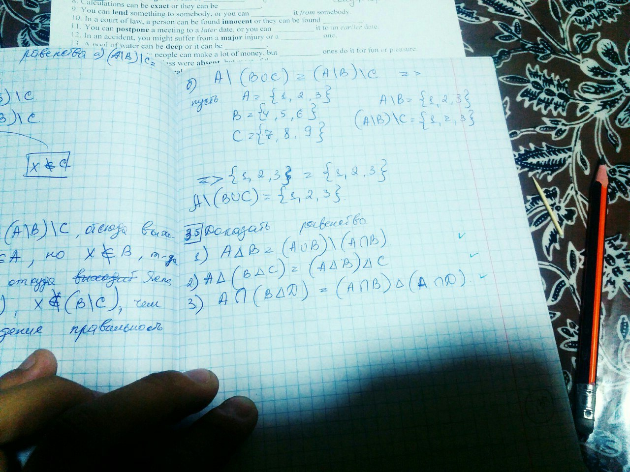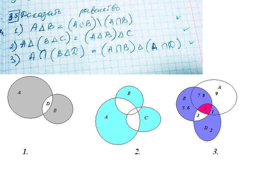 1,Пусть,A={1;2;3;4;5;6} , B={4;5;6;7;8}⇒AΔB={1;2;3;7;8}