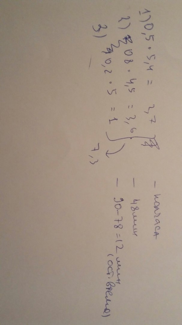 Турист шёл пешком полтора часа. Первые пол часа он шёл со скоростью 5,4км/ч, затем 48 минут со скоростью 4,5км/ч а оставшиеся время со скоростью 5км/ч. Какое расстояние он прошёл за эти