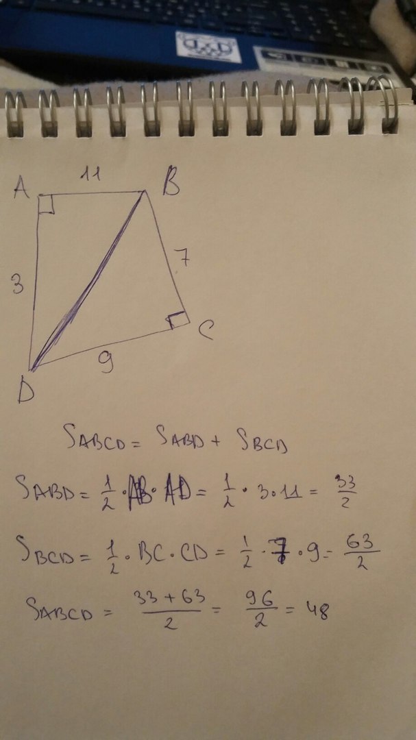 Стороны четырëх угольника АBCD равняются: АВ=11,ВС=7, CD =9,AD=3 , а углы А и С -прямые
