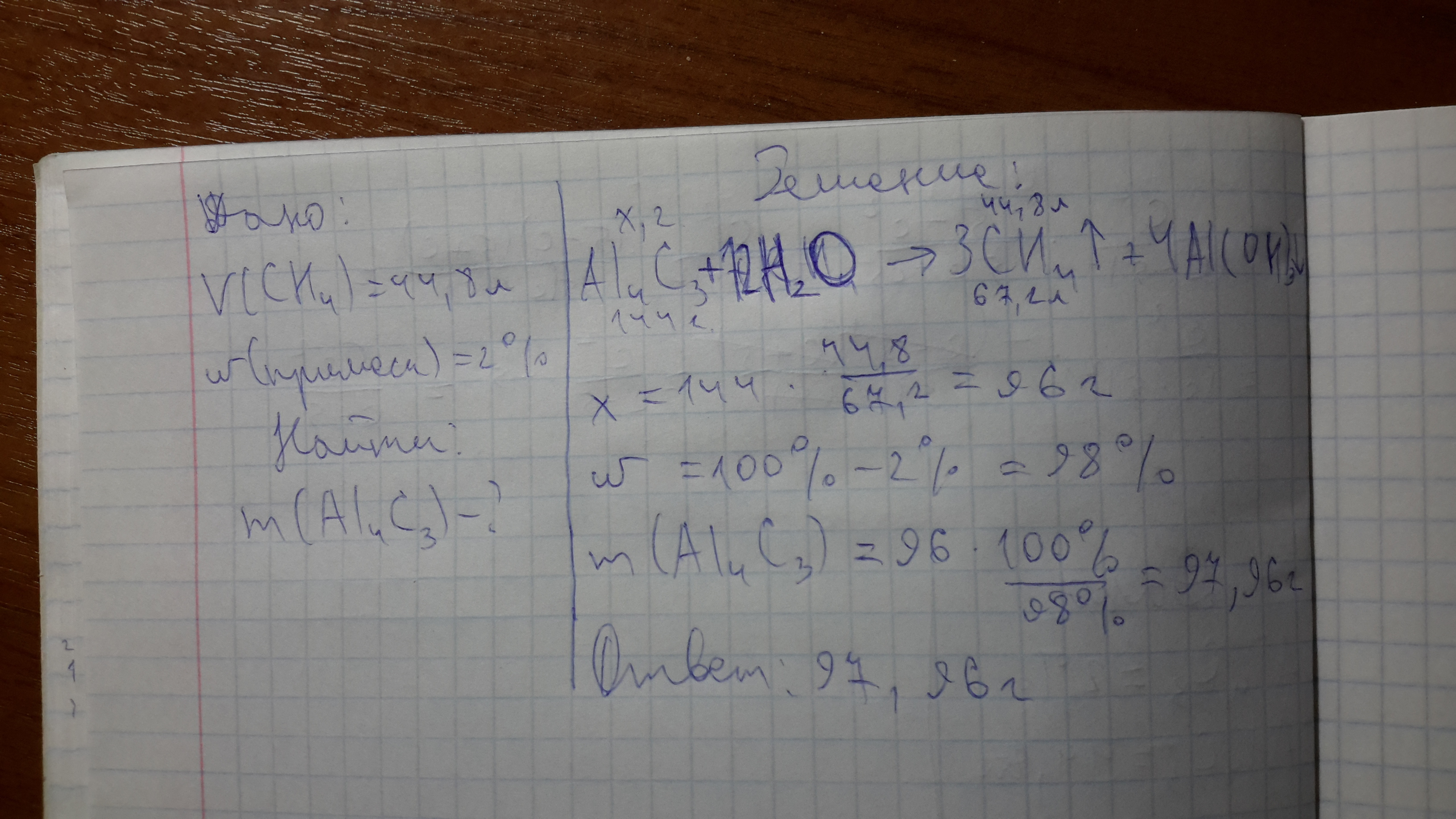 вычислить массу карбида алюминия, содержащего 2% (по массе), необходимого для получения 44,8л (н.у.) метана