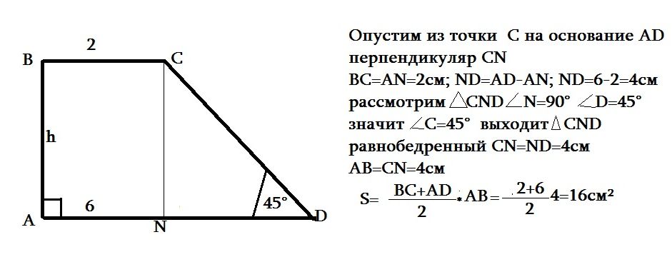 найти площадь прямоуголбной трапеции основания которой равны 6 и2 большая боковая сторона составляет с основанием угол 45 градусов