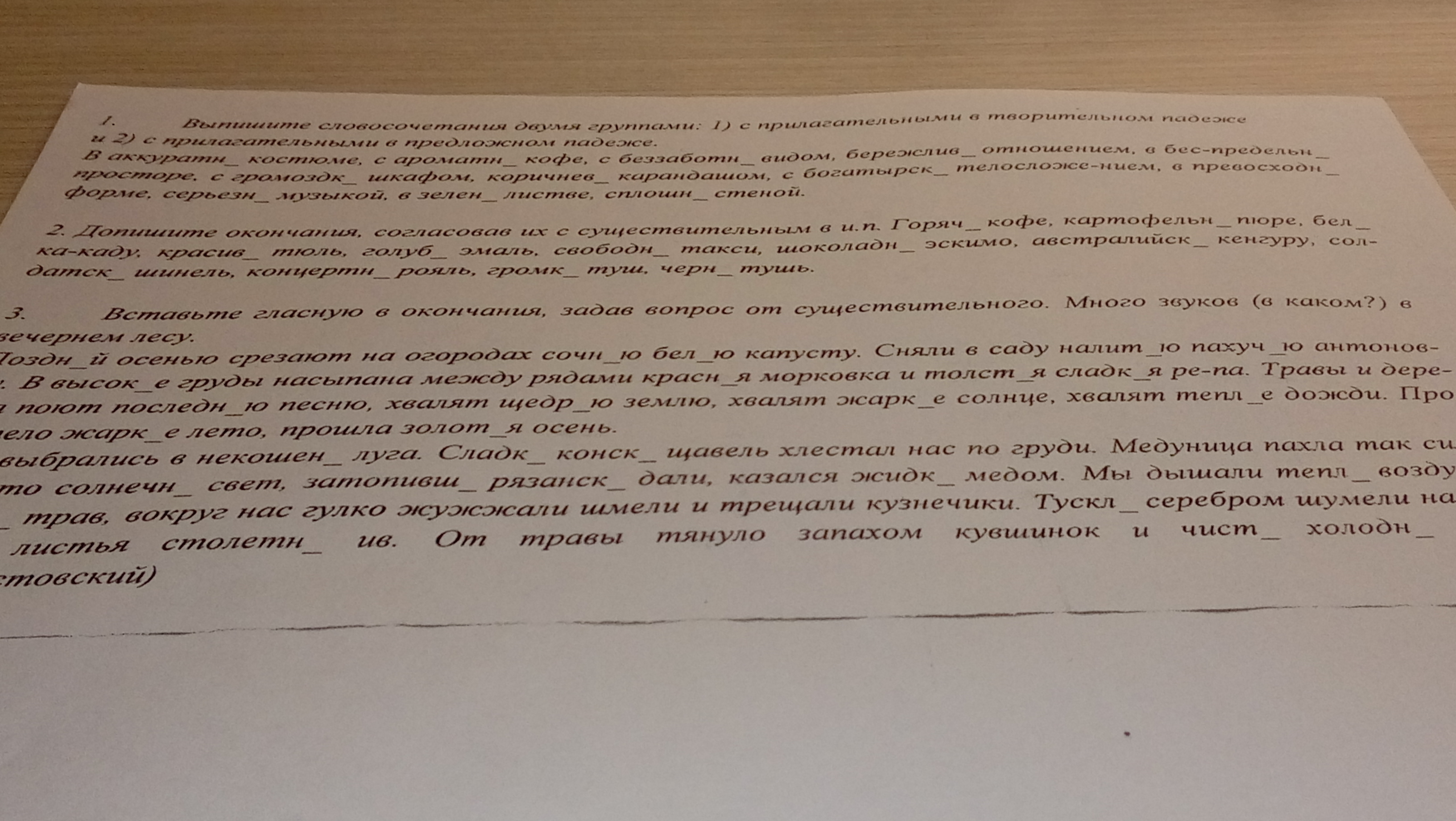 Т.п кем, чем? П. п о ком. о чем? аккуратным, аккуратном.ароматным- ароматном,беззаботным- беззаботном, бережливым- бережливом.беспредельным- беспредельном,громоздким- громоздком,коричневым-коричневом,серьезным серьезной, зеленым- зеленой,сплошным- сплошной. 2)горячий, картофельное, красивый,голубая,свободное,шоколадное,австралийский,солдатская,концертный.громкий, черная