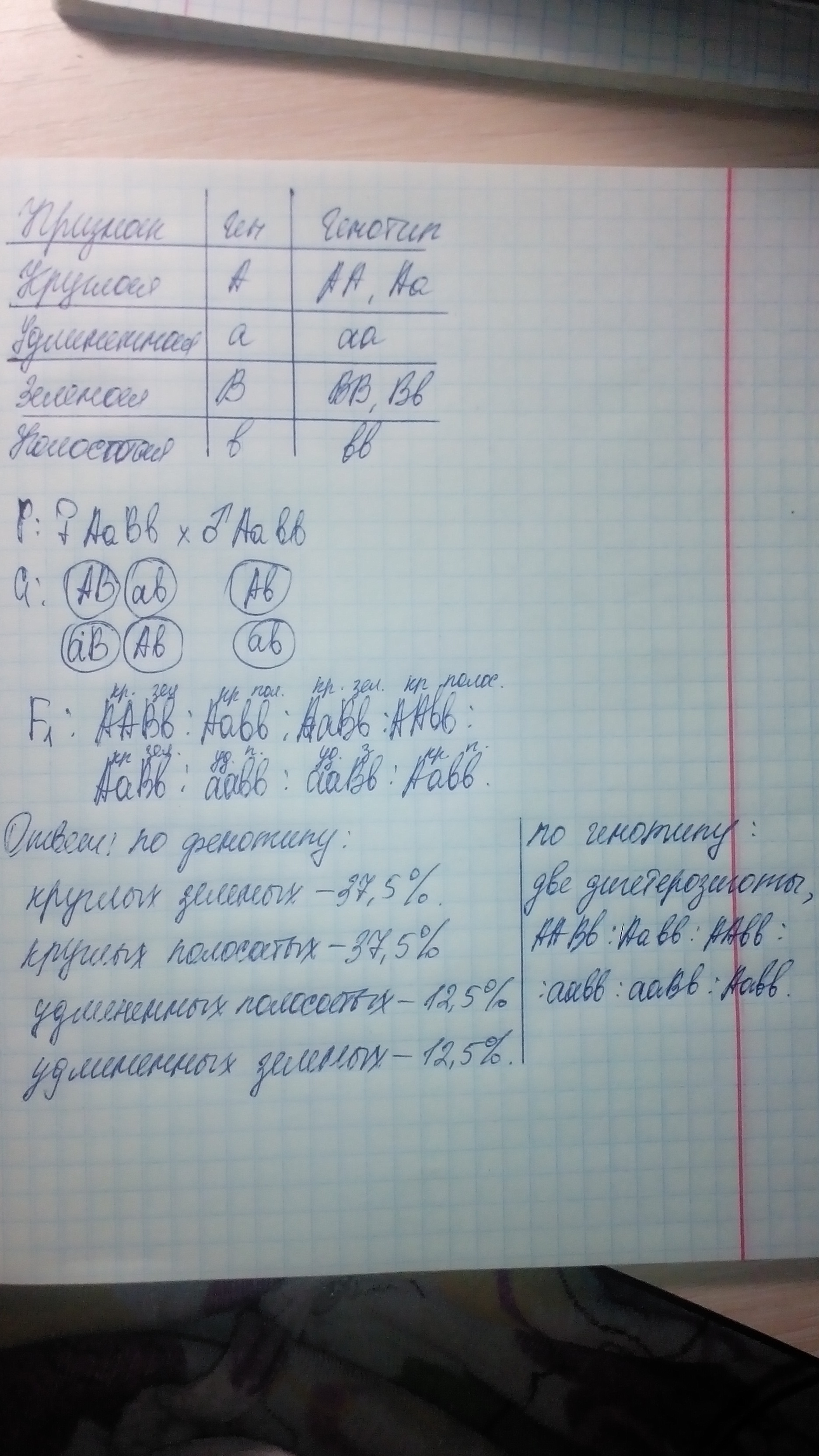 Задача следующая: "У арбуза круглая форма плода доминирует над удлинённой, а зелёная окраска над полосатой. Скрещиваются круглые по форме, но разные по окраске растения, гетерозиготные по возможным признакам. Каким по генотипу и фенотипу будет F1?"