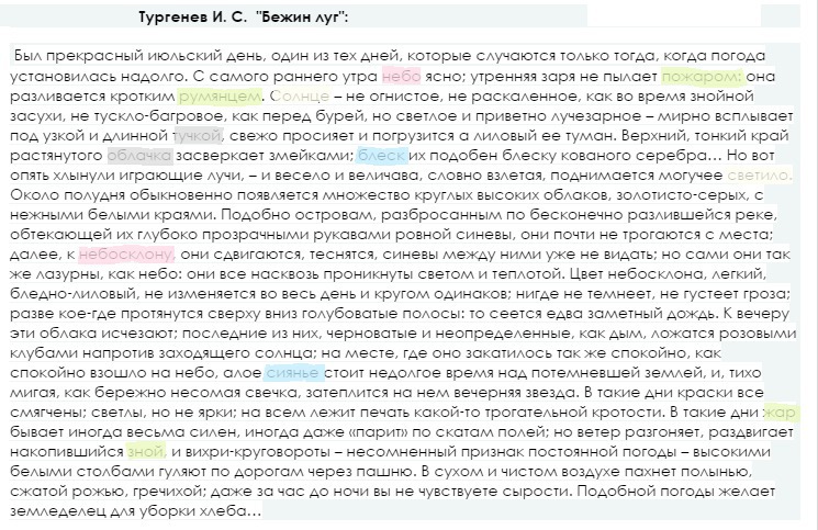 В рассказе Тургенева Бежин луг выделены группы синонимов: 1. небо, небосклон, 2 солнце, светило. 3 тучка, облачко, 4. блеск, сиянье, 5. пожар, жар, румянец, зной