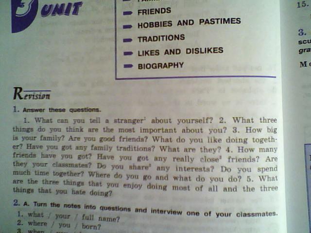 1. Что вы можете сказать о себе незнакомца? 2. Какие три ь вы думаете, являются наиболее важными о вас? 3. Насколько велика ваша семья? Вы хорошие друзья? Что вы любите делать togeth Вы выпотрошить любые семейные традиции? То, что они? многие концы у вас есть? Есть ли у вас действительно близких друзей? Являются ли ваши Разделяете ли Вы какой-либо потратить инте ли вы уч время вместе? Куда вы идете, и что вы будете делать? 5. Что е три вещи, которые вы любите делать хорошо и три, что вы ненавидите делать? Включите примечания в вопросы и интервью у одного из своих одноклассников. какое твое полное имя? Где ты родился?