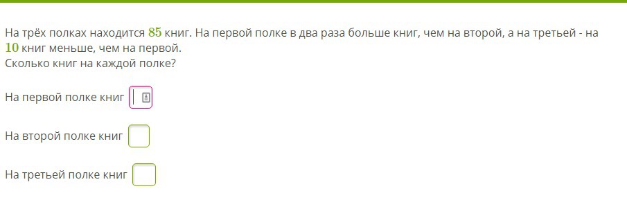 смотри, обозначаем количество книг на второй полке за X, тогда на первой полке будет 2x, а на 3 полке 2x-10. Составим уравнение