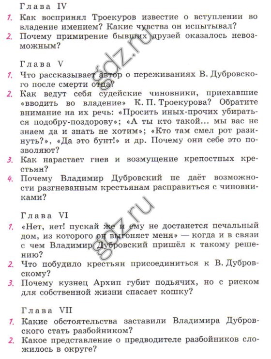 4(1) Троекуров смутился: «От природы не был он корыстолюбив, желание мести завлекло его слишком далеко, совесть его роптала. Он знал, в каком состоянии находился его противник, старый товарищ его молодости, и победа не радовала его сердце».