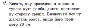 Высота, которая проведена из вершины тупого угла ромба, делит противолежащую сторону пополам. Вычислите меньшую диагональ ромба, если его периметр 20 см.