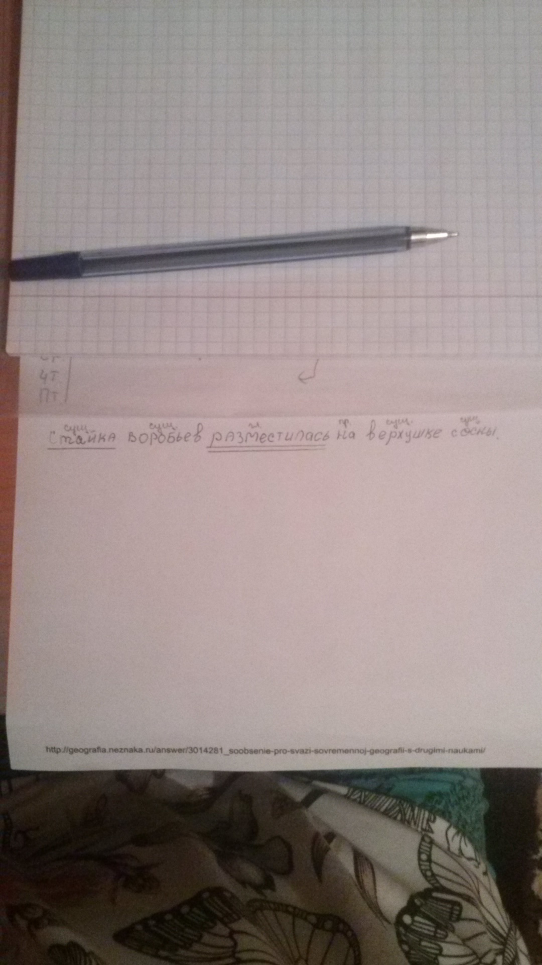 Смайка(сущ)воробьев(дополнение)разместилась(глагол) на(предлог)верхушке(обстоятельство)сосны(дополнение)