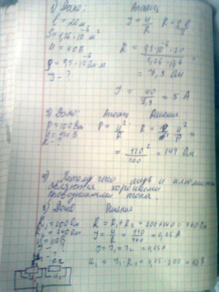 1. Определите силу тока на участке цепи, состоящей из константановой проволоки длиной 20 м, сечением 1,26 мм2, если напряжение на концах этого участка 40 В (5 А).