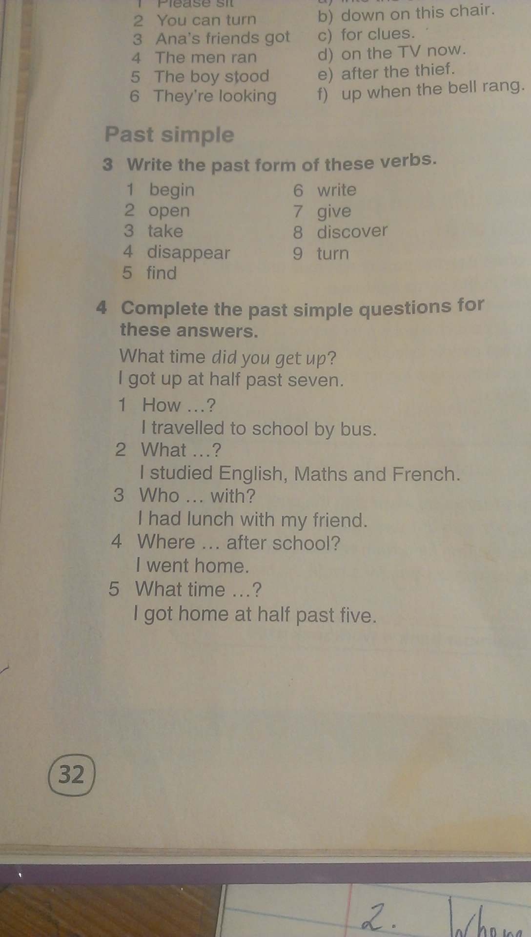 begun,opened, taken ,disappeared ,found, writen ,given ,discovered ,turned. How did you travell to school?what did you study?who did have lunch with you?where did you go after school?what time did you get home?