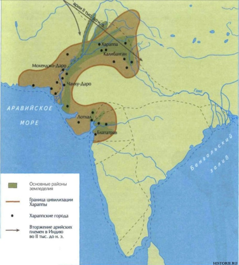 Определённую роль в упадке и гибели городов долины Инда сыграло вражеское вторжение. Именно в тот период в Северо-Восточной Индии появляются арии — племена кочевников из среднеазиатских степей. Возможно, их нашествие стало последней каплей на чаше весов судьбы хараппской цивилизации. Из-за внутренних неурядиц города не смогли противостоять натиску врага. Их жители отправились искать новые, менее истощённые земли и безопасные места: на юг, к морю, и на восток, в долину Ганга. Оставшееся население вернулось к простому сельскому образу жизни, как было за тысячу лет до этих событий. Оно восприняло индоевропейский язык и многие элементы культуры пришельцев-кочевников.