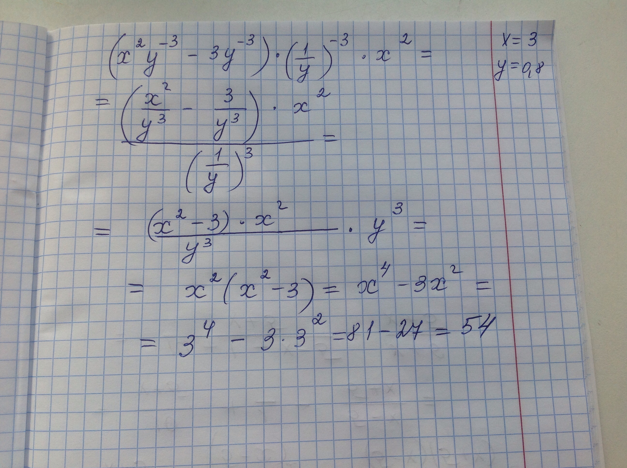Вычислительной значение выражения(x^2•y^-3-3y^-3)•(1/y)^-3•x^2