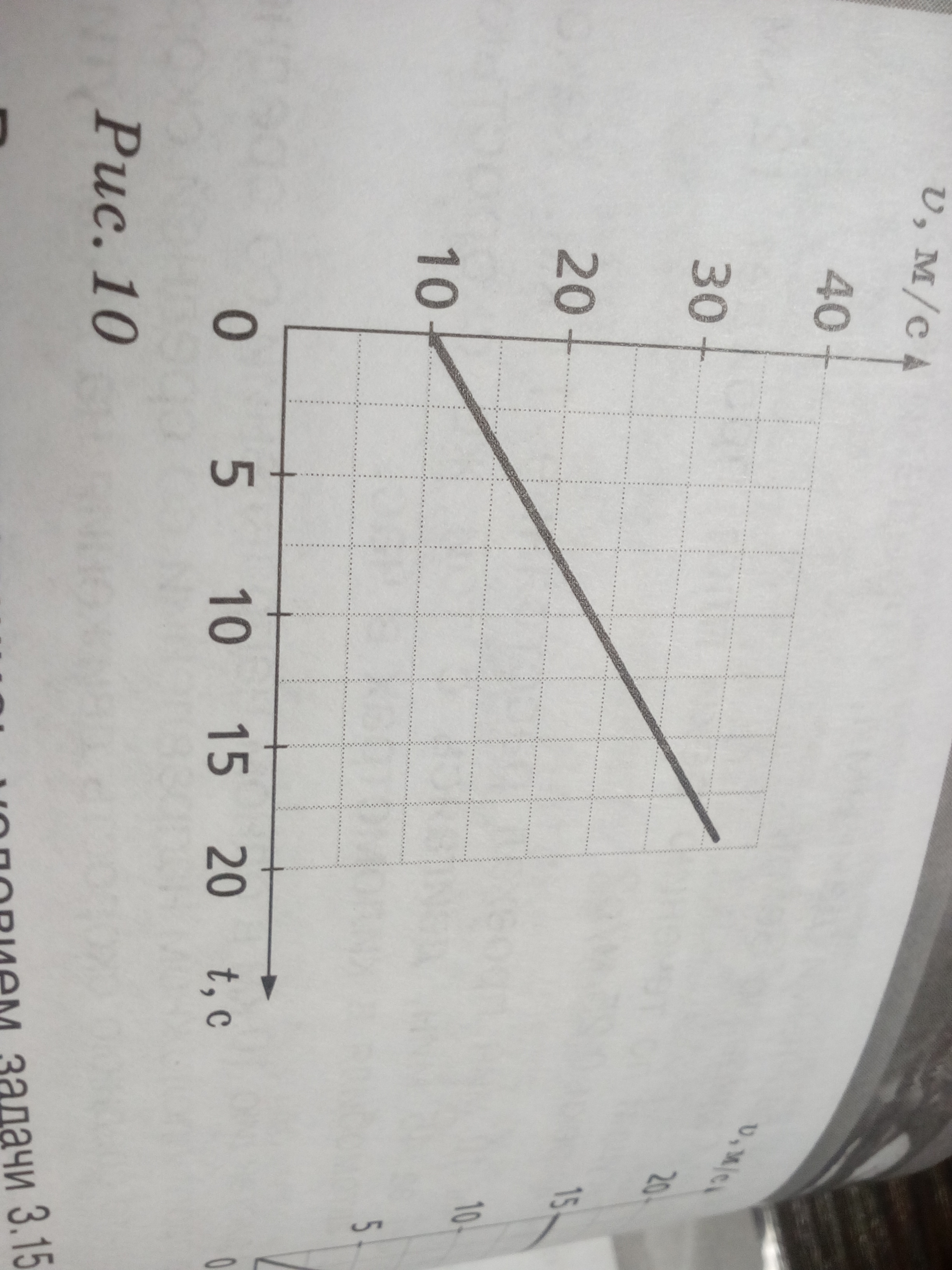 На рисунке 10 приведён график зависимости скорости движения тела от времени. Определите начальную скорость тела, скорость тела через 15 с после начала отсчёта и ускорение тела.