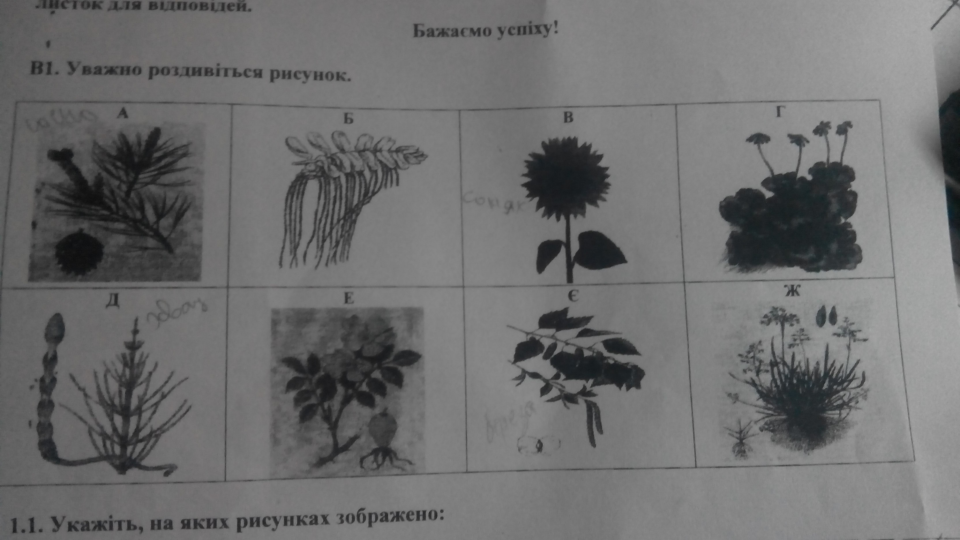 Очень плохое качество рисунка, поэтому перепроверьте, пожалуйста: А - сосна; Б - кажется ряска (не видно на рисунке), Г- не разобрать что на рисунке (возможно герань по форме листа); Е -шиповник; Э (извините буква наоборот) - береза; Ж - тоже не возможно разобрать картинку.