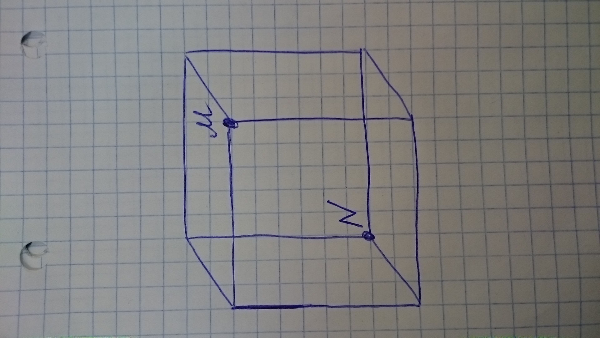 Комната имеет форму куба.Муха ползет из точки М в точку N.Она не летает.Вопрос,Как муха доберется до точки N?