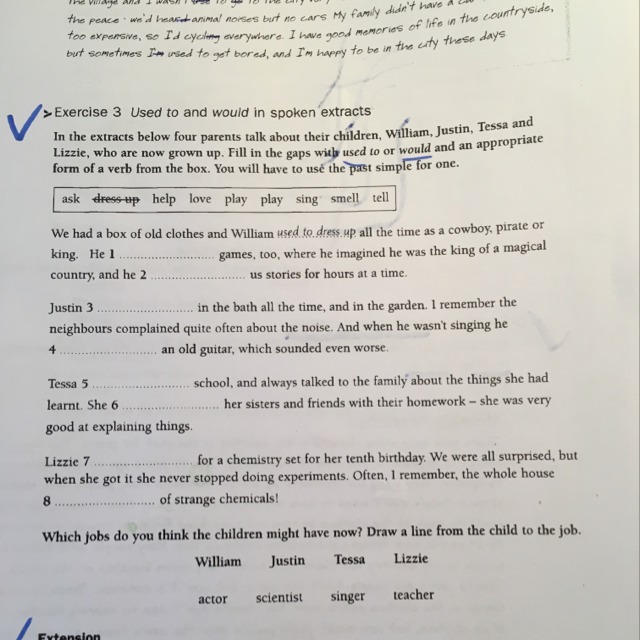 1 used to play. 2 would tell. 3 used to sin. 4 would play. 5 would love. 6 used to help. 7 would ask. 8 used to smell.
