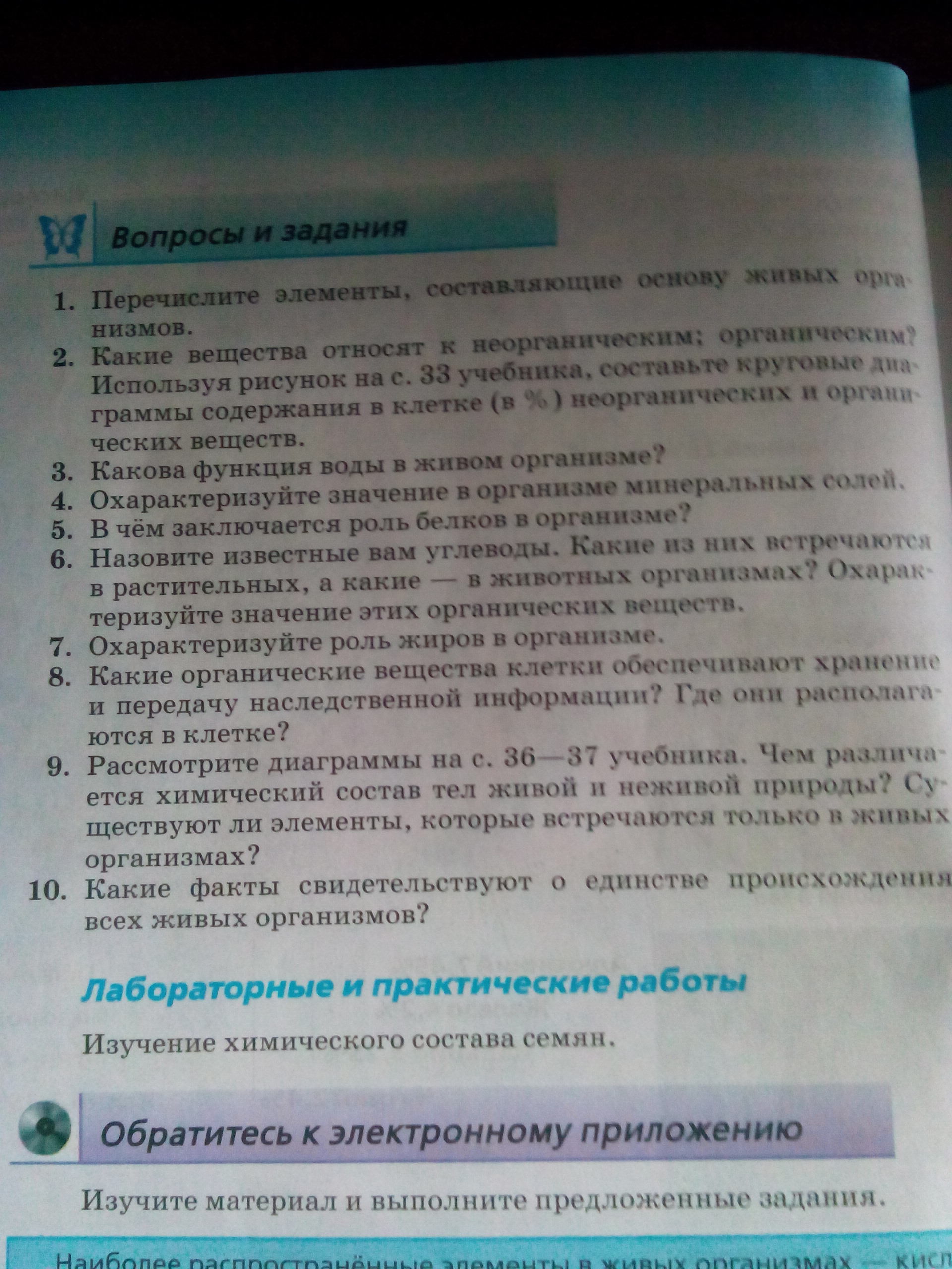 1.В состав живых организмов входят органические вещества (белки, жиры, углеводы, нуклеиновые кислоты) и неорганические вещества (вода, минеральные соли).