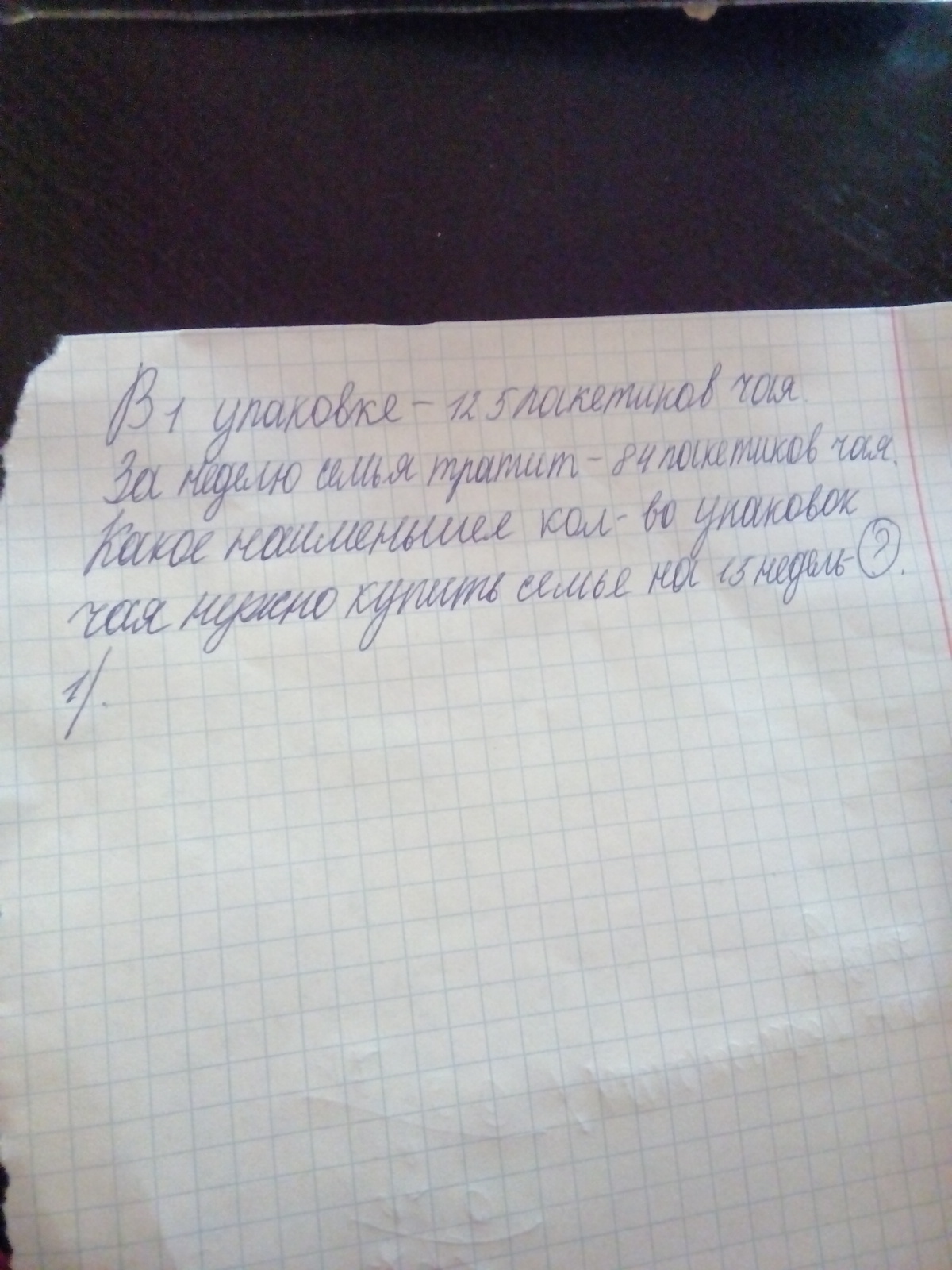 В 1 упаковке - 125 пакетиков чая , за неделю семья тратит 84 пакетиков чая , какое наименьшее кол-во упаковок чая нужно купить семье на 15 недель. помогите решить.