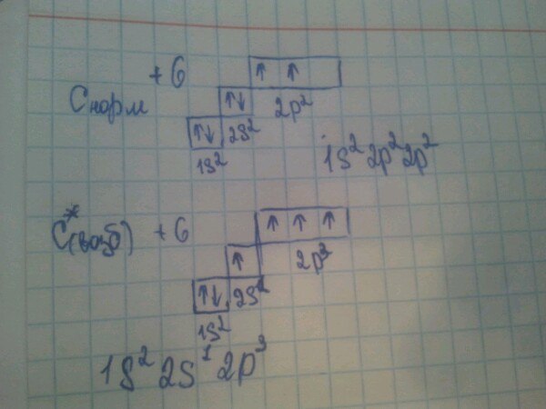 Изобразите электронную конфигурацию атома углерода и его электронное строение в нормальном и возбужденном состоянии. Объясните, почему углерод в соединениях 4х валентный.