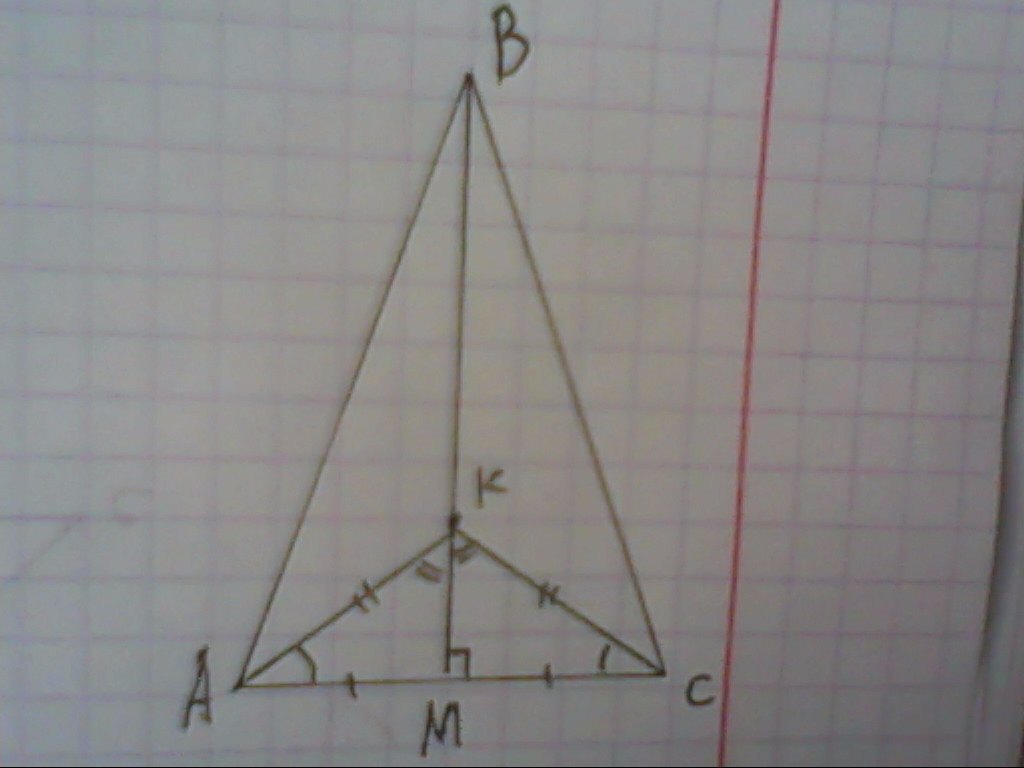 АК=СК; АМ=СМ; ΔАВК=ΔСВК; ∠ВАК=∠ВСК: ∠АВК=∠СВК; ΔАВК=ΔСВК. АВ=ВС по условию ΔАВС равнобедренный