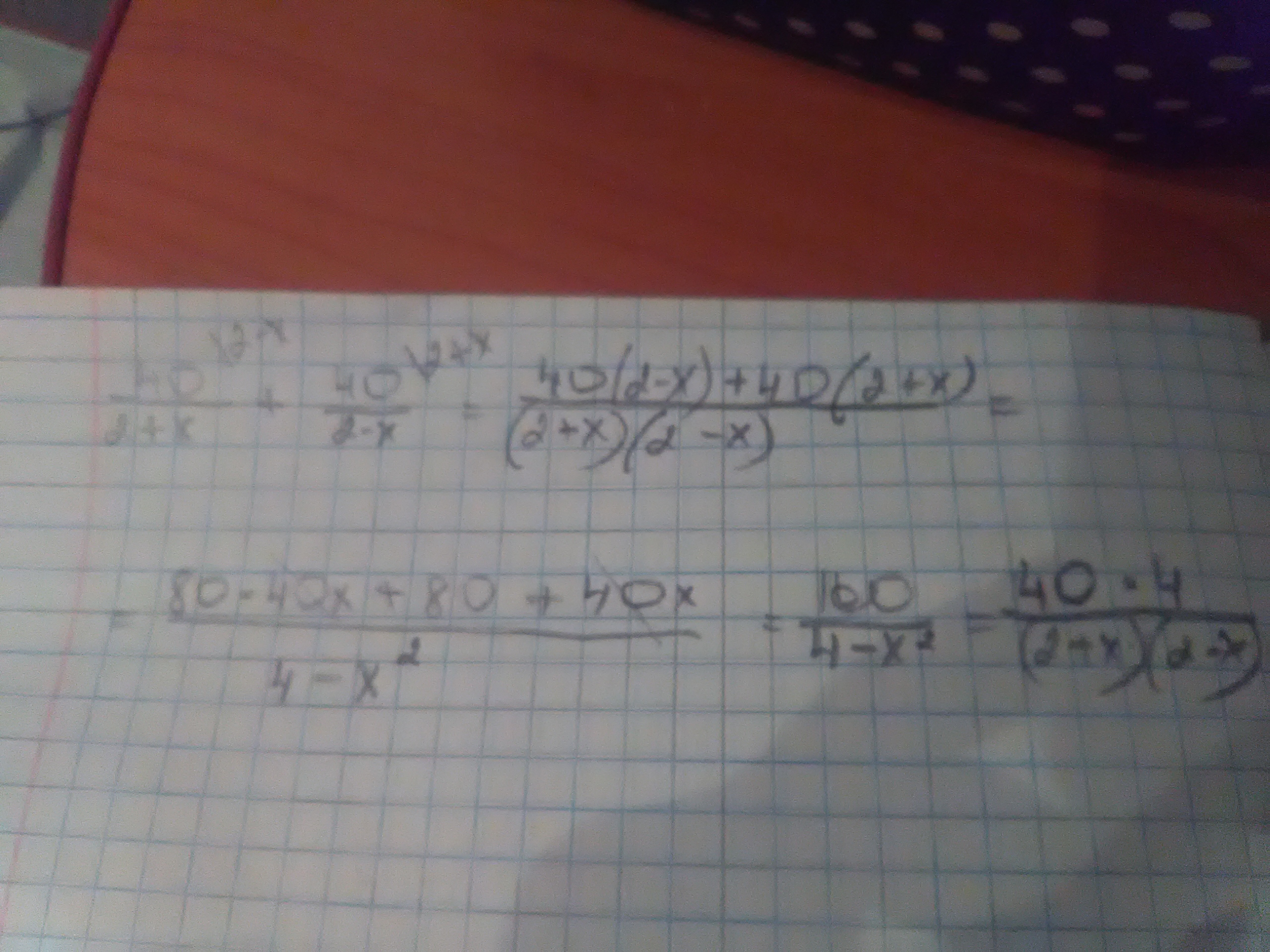 Раскрываем скобки = 80-40х+80+40х, знаменатель тот же! Сокращаем подобны т.е -40х и 40х - сумма их ноль . и получается у нас 80+80=160. Знаменатель можно преоброзовать как как 4- х^2