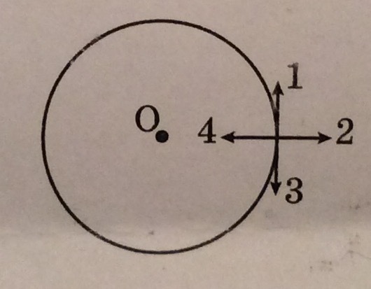2. Тело движется равномерно по окружности по часовой стрелке (см.рисунок). Какая стрелка указывает направление вектора ускорения при таком движении?