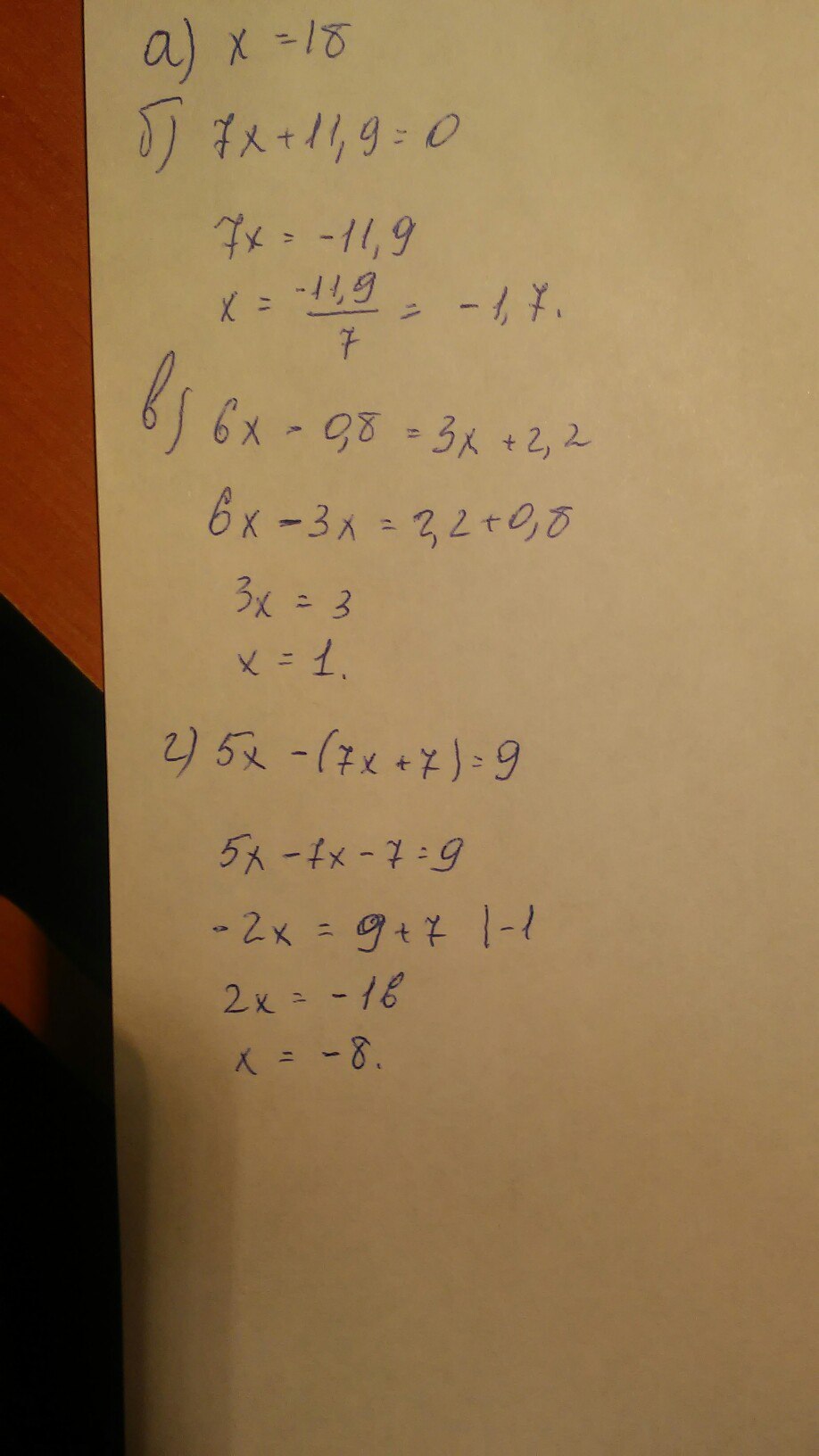 Решите уравнение: а) х = 18; б) 7x + 11,9 = 0; в) 6х - 0,8 = 3х + 2,2; г) 5х - (7х + 7) = 9.