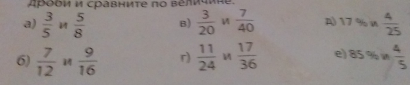 е) 85/100 = 17/20 и 4/5= 16/20 или 17>16