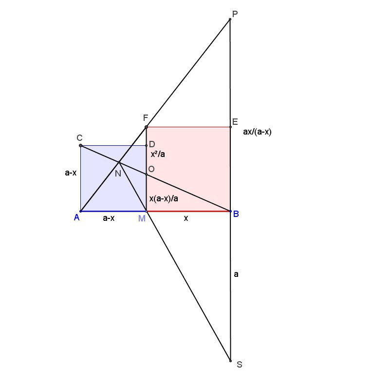 Таким образом, BS=PB·MO/OF=(ax/(a-x))·(x(a-x)/a)·(a/x²)=a. Итак, видим, что длина BS не зависит от положения точки M на отрезке AB, т.е. точка S - искомая.