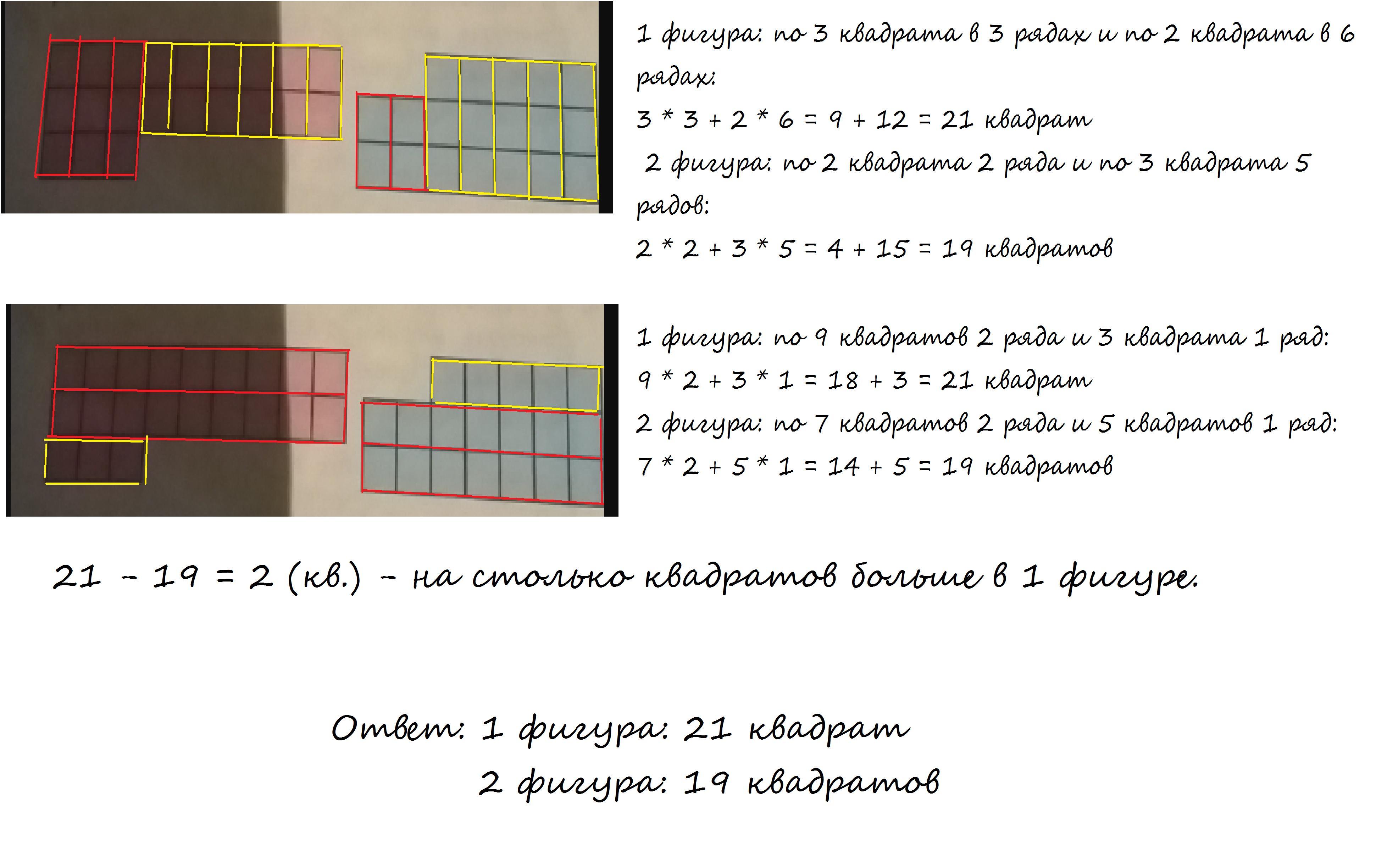 посчитай разными способами на сколько одинаковых квадратов разбита каждая фигура в какой из них поместилось больше квадратов
