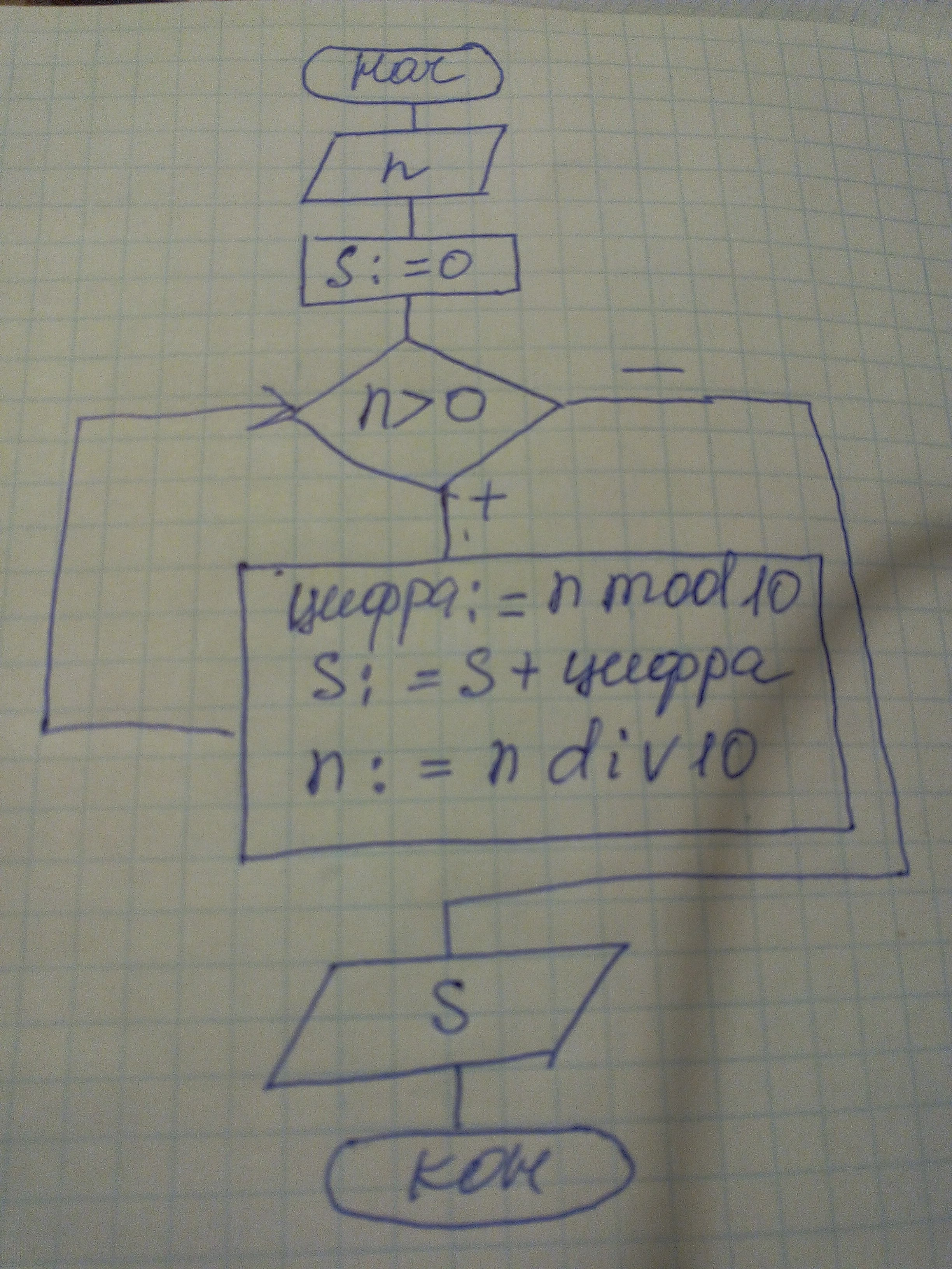Дано натуральное число n.Определить сумму его цифр. Как преобразовать это в блок-схему по алгоритмизации?