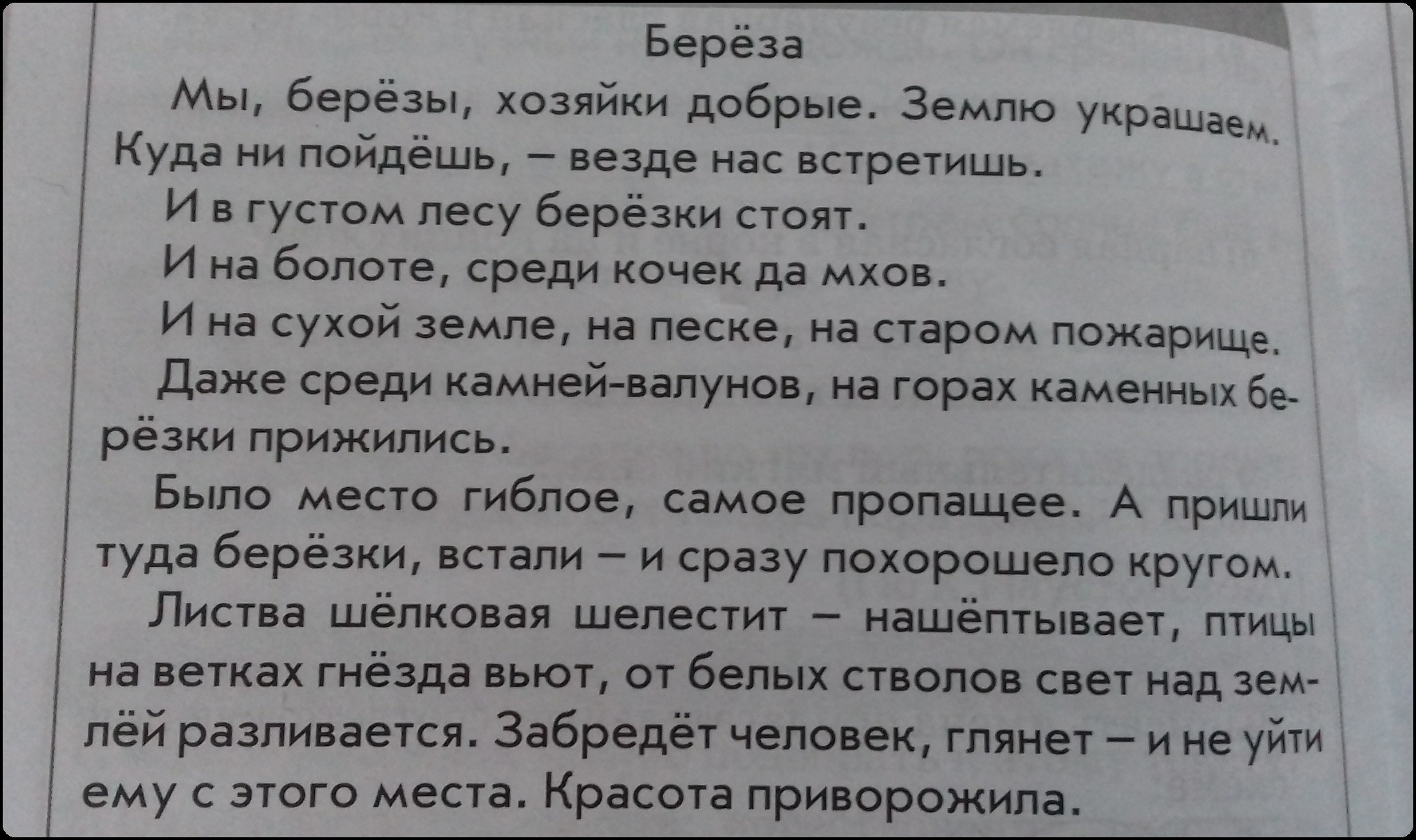 1. Берёза, песке, человек, болоте, пожарище, похорошело, шёлковая, красота.
