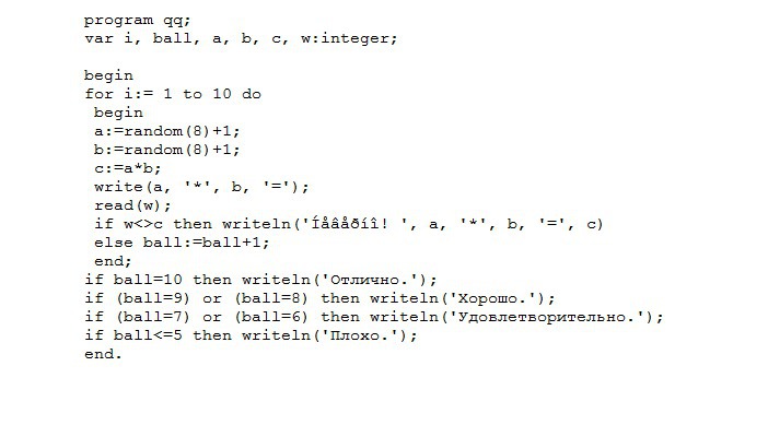 Паскаль. Написать программу проверки знания таблицы умножения. Программа должна ввести 10 примеров и выставить оценку: 10 правильных ответов - отлично, 8-9 - хорошо, 6-7 удовлетворительно, 5 и менее - плохо.