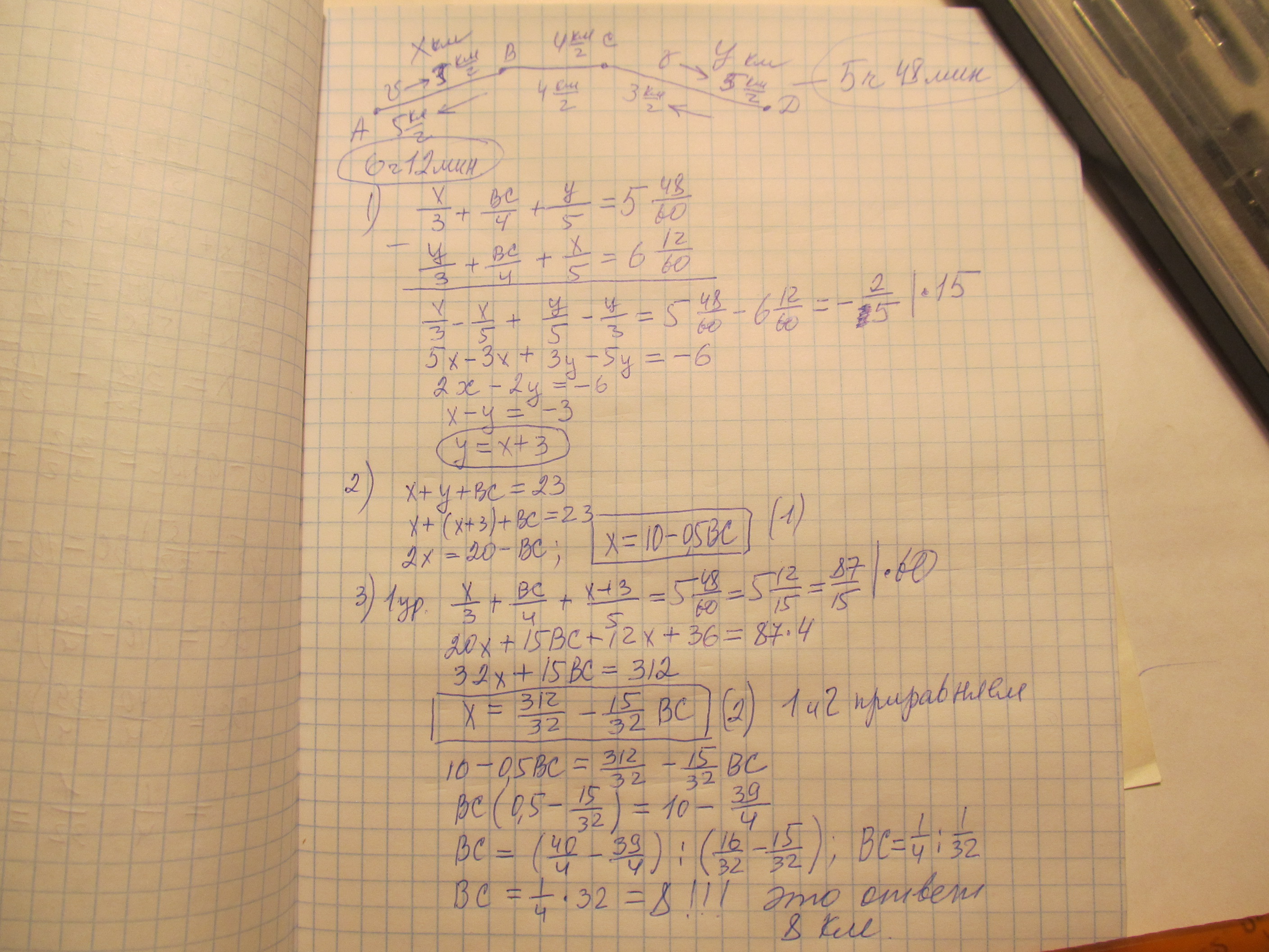 Дорога от A до D длиной в 23 км идет сначала в гору, затем — по ровному участку, а потом — под гору. Пешеход, двигаясь из A в D, прошел весь путь за 5 ч 48 мин, а обратно, из D в A, — за 6 ч 12 мин. Скорость его движения в гору равна 3 км/ч, по ровному участку — 4 км/ч, а под гору — 5 км/ч. Определить длину дороги по ровному участку.