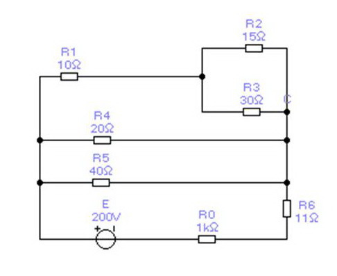 E=200 B , R1=10 Ом, R2=15 Ом, R3=30 Ом, R4=20 Ом, R5=40 Ом, R6=11 Ом, I6=10 A.