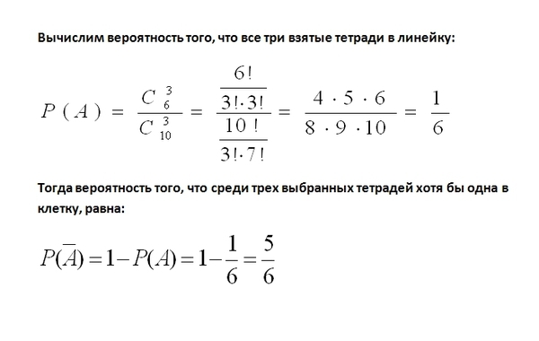 В пачке 10 тетрадей, из которых шесть тетрадей в клетку, а остальные в линейку. Найти вероятность того, что среди одновременно взятых наудачу из пачки трех тетрадей хотя бы одна тетрадь окажется в клетку.