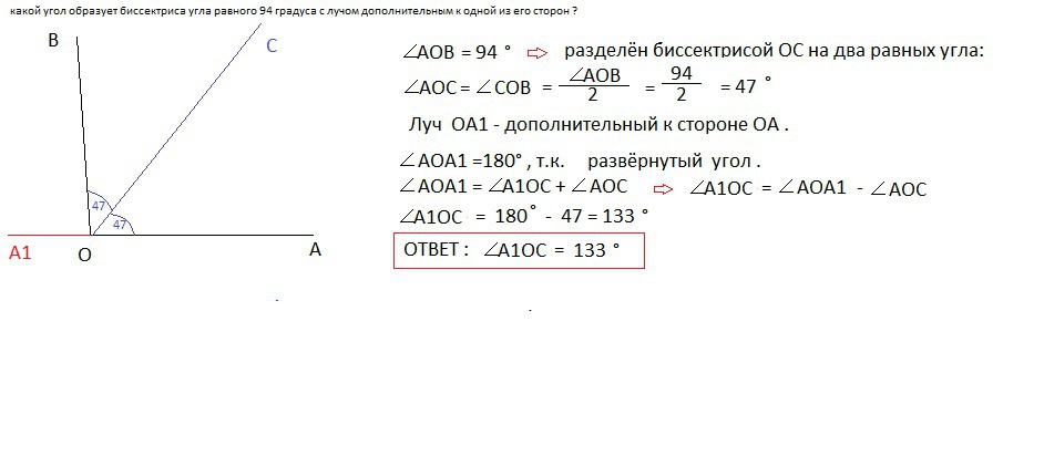 какой угол образует биссектриса угла равного 94 градуса с лучом дополнительным к одной из его сторон ?