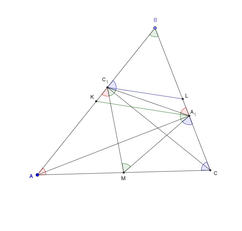 Пусть АА1 и СС1 высоты остроугольного неравнобедренного треугольника АBС,а К, L, M середины сторон AB, BC и CA соответственно. Докажите, что если угол C1MA1 = углу ABC, то C1K = A1L